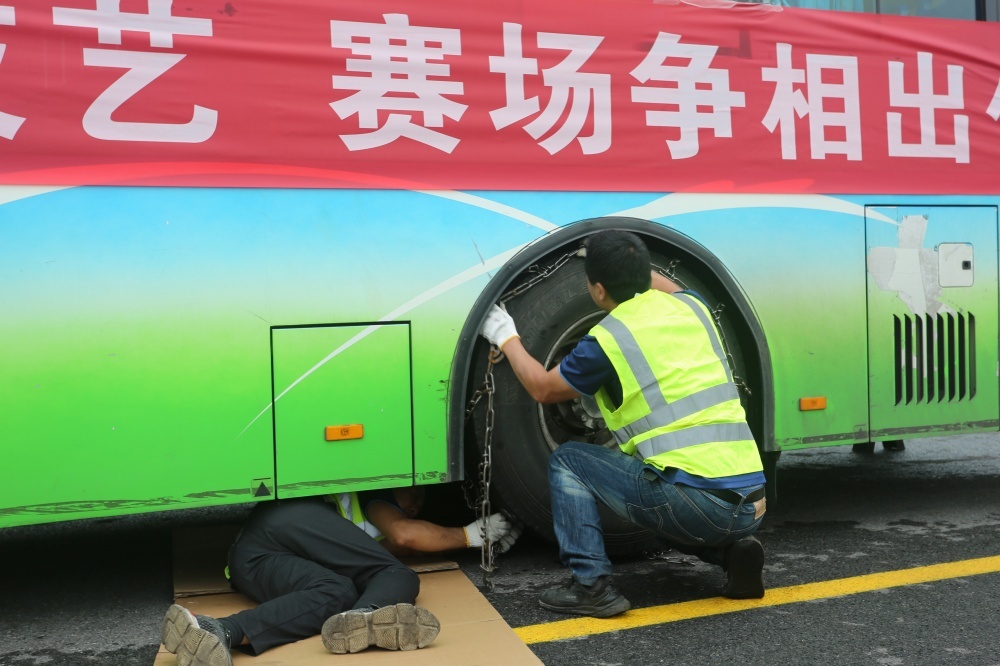 在安裝防滑鏈項(xiàng)目比武現(xiàn)場(chǎng),市公交集團(tuán)汽修公司員工王剛、劉小備兩人準(zhǔn)備充分、配合默契——先由一人進(jìn)入車底檢查車況,一人拿出防滑鏈等待安裝。很快,車況檢查結(jié)束,兩人迅速將防滑鏈套上輪胎,并將防滑鏈上的橡皮繩捆扎成規(guī)則五角形,經(jīng)檢查內(nèi)外側(cè)松度并無明顯松垮現(xiàn)象后,以3分09秒的成績(jī)結(jié)束比賽。