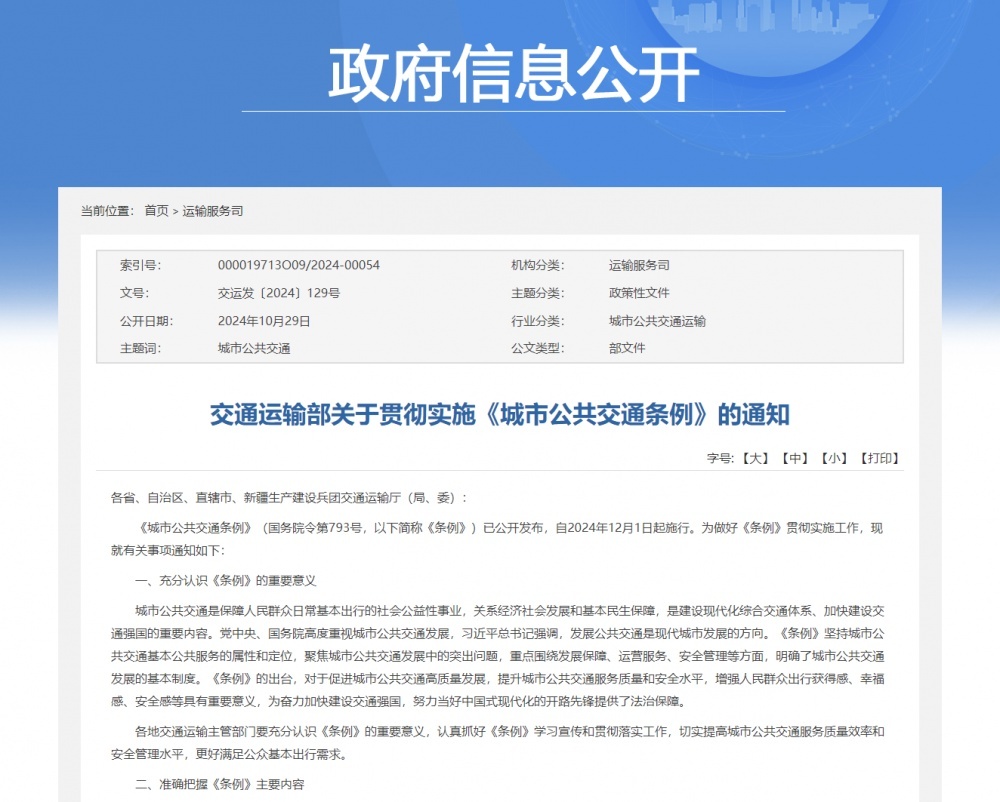 10月29日,交通運(yùn)輸部網(wǎng)站發(fā)布《關(guān)于貫徹實(shí)施〈城市公共交通條例〉的通知》。通知提到,從充分認(rèn)識(shí)《條例》的重要意義、準(zhǔn)確把握《條例》主要內(nèi)容、有力保障《條例》落地實(shí)施來(lái)貫徹實(shí)施。