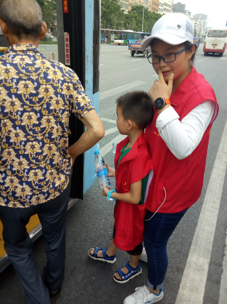 15時許,志愿者們已經(jīng)布置好了送水點,將箱礦泉水擺在了站臺旁邊。每有一輛公交車進站停靠,志愿者們都會給駕駛員們遞上兩瓶礦泉水,還有一些放暑假的小朋友們,也熱情的加入到此次活動,充當著志愿主力軍,用他們的行動清涼了公交駕駛員的心,傳播著社會正能量。