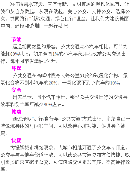 此外,在"公交出行宣傳周"到來之際,荊門公交集團公司呼吁廣大車主,請遵守交通規(guī)則,尤其在上下班高峰期時不要隨意駛?cè)牍粚S玫馈?/p>